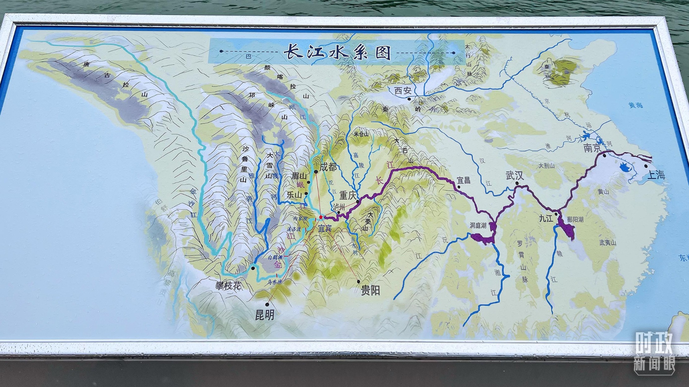 △2022年6月,习近平在四川宜宾三江口考察。图为现场展出的《长江水系图》。(总台央视记者张宇拍摄)